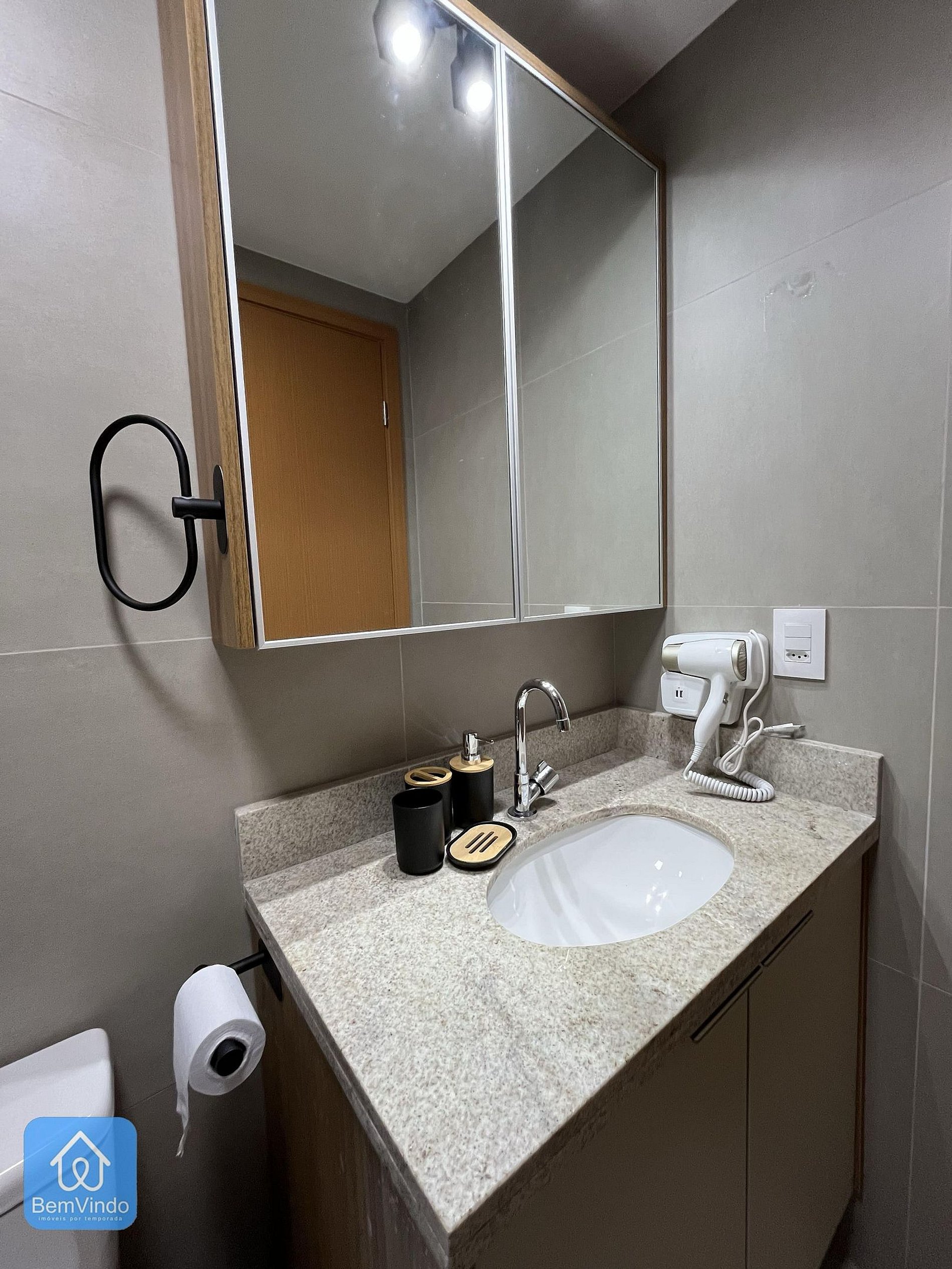 O banheiro é amplo e confortável, com todos os itens essenciais para uma estadia agradável.