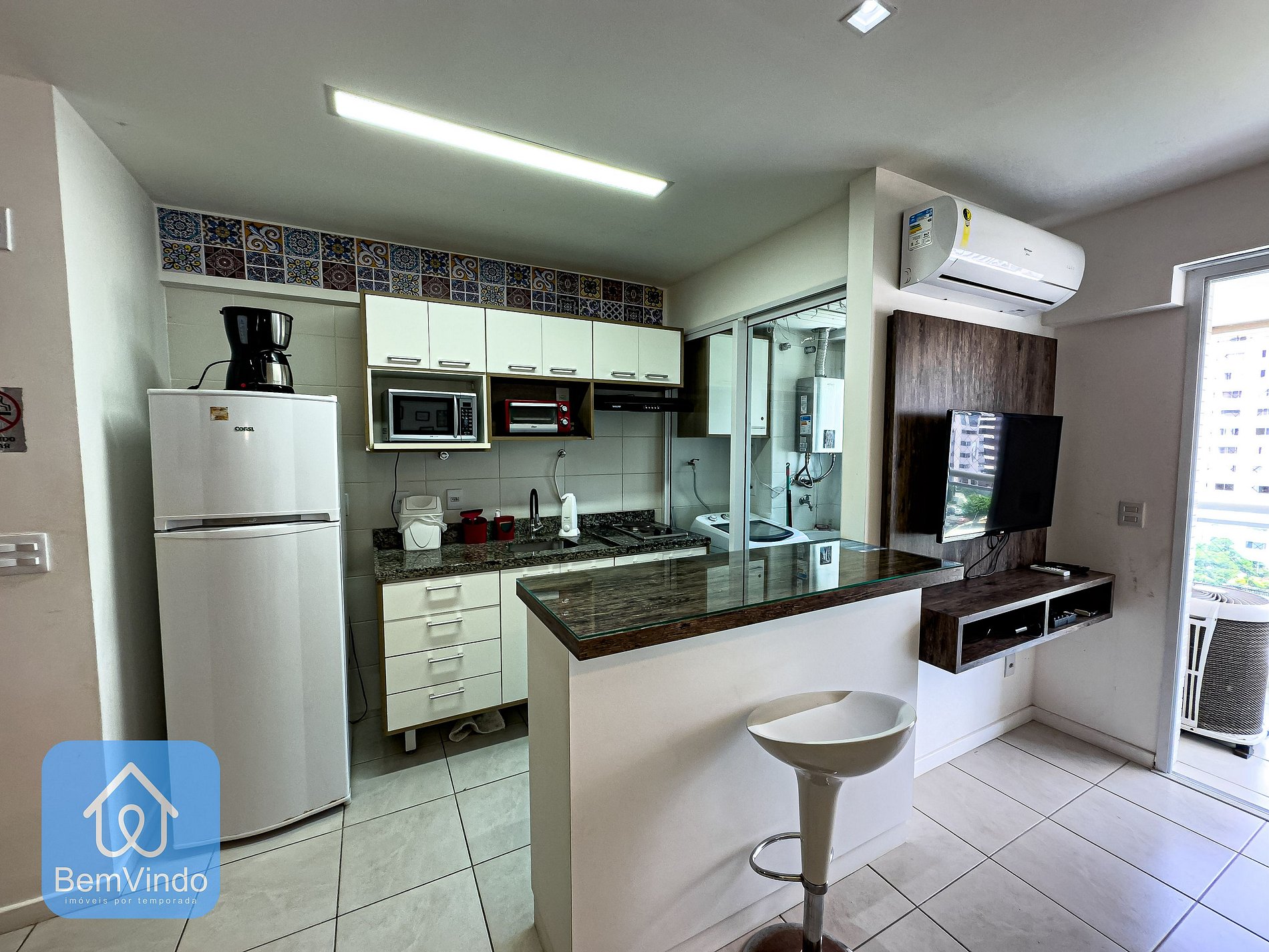 Nossa Cozinha é completa com fogão cooktop, microondas, e todos os equipamentos que você pode precisar para preparar o seu alimento. O apartamento ainda possui, uma área de lavanderia com máquina de lavar e secar, prontas para seu uso. Possuímos uma vaga de garagem;