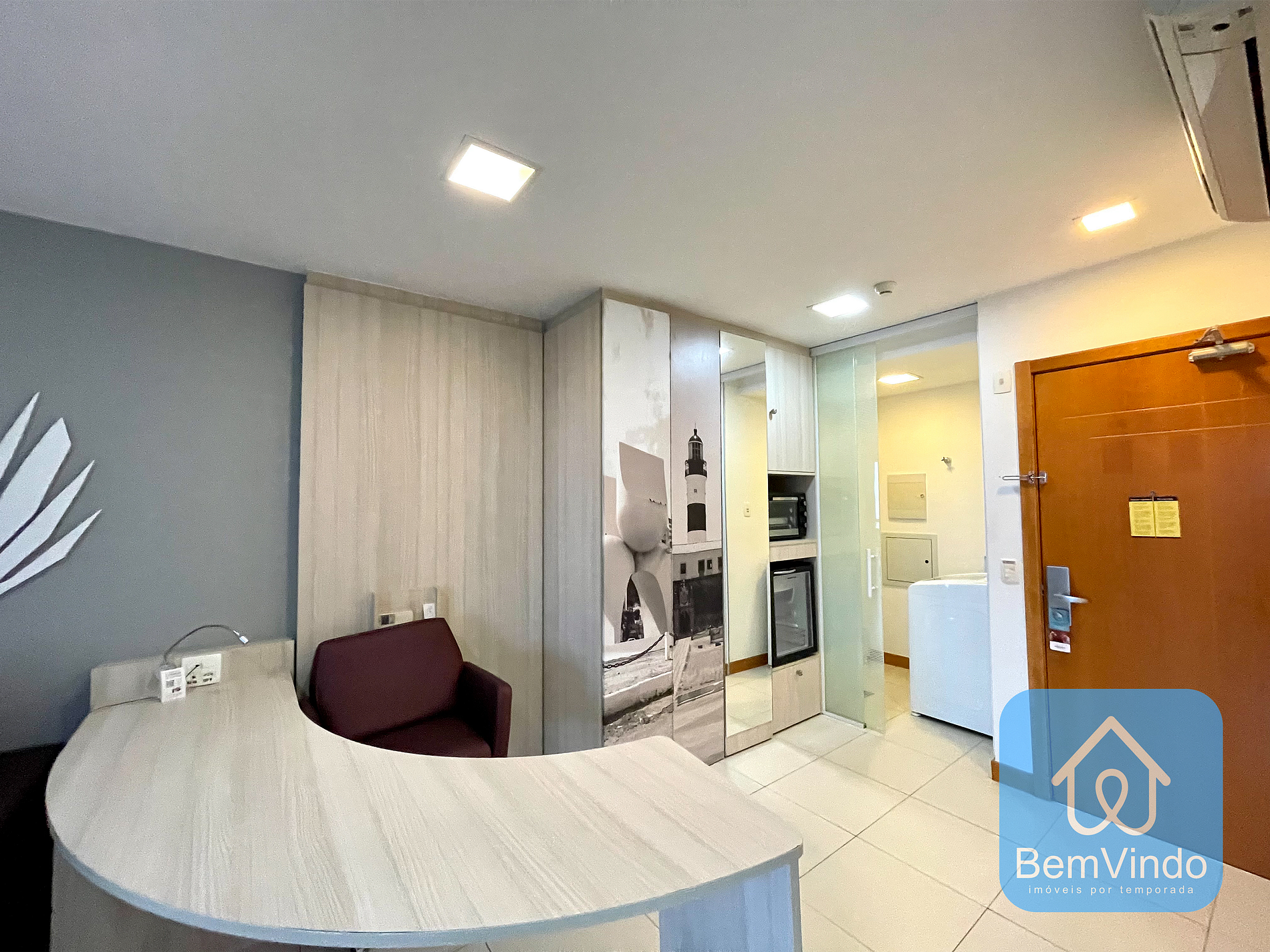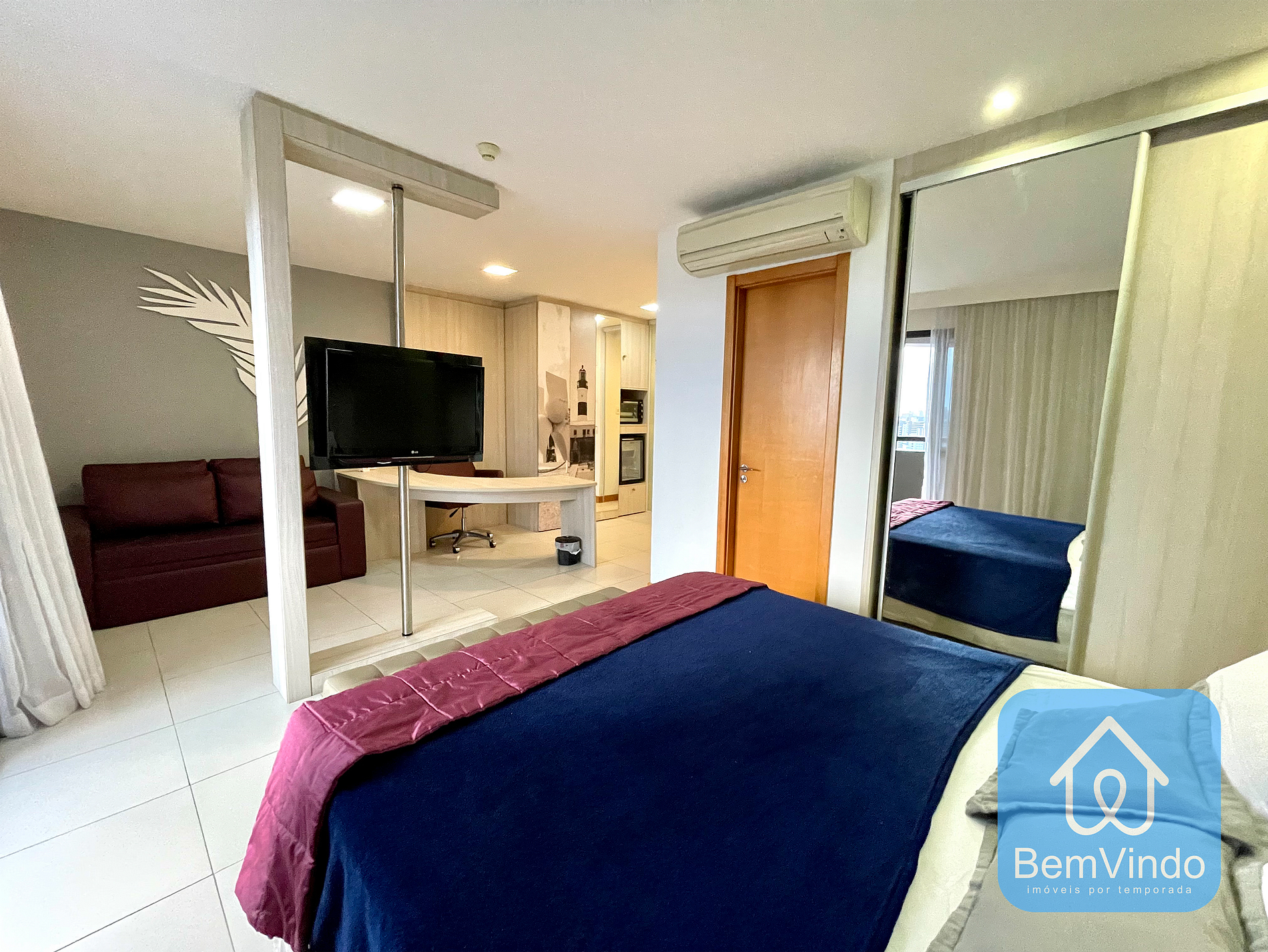 A sala é decorada com móveis planejados para oferecer o maior conforto possível, além de um sofá para relaxar o apartamento conta com uma cama queen nova e confortável e dois ar condicionados para resfriar o calor Baiano;