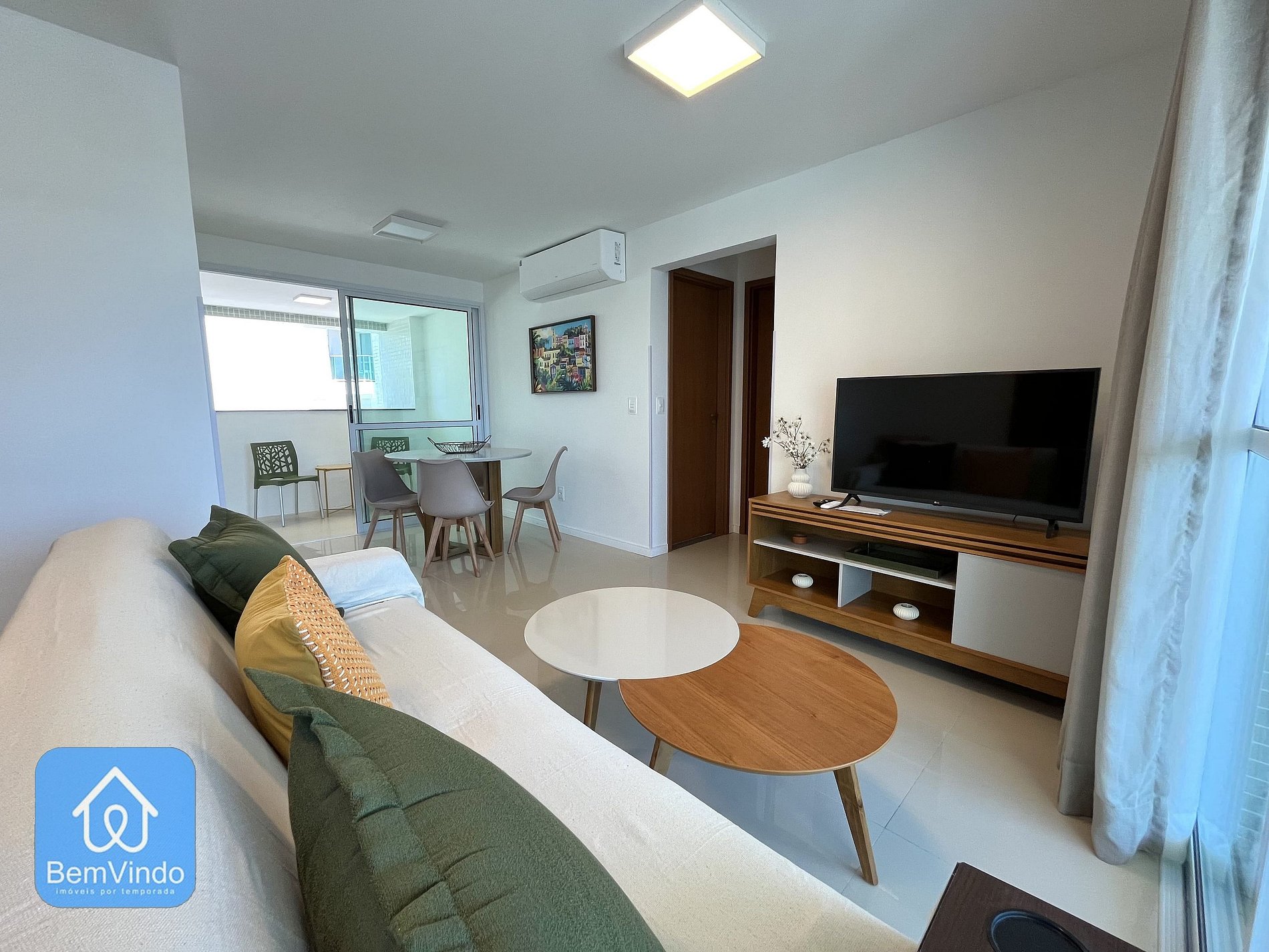 A sala de estar é espaçosa e aconchegante, com um sofá confortável e Smart TV, criando um ambiente acolhedor para relaxar.