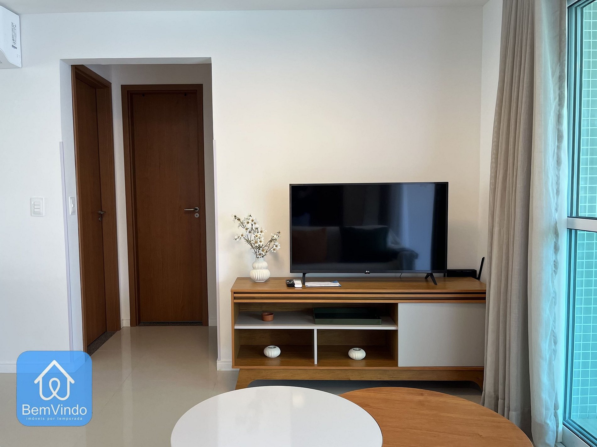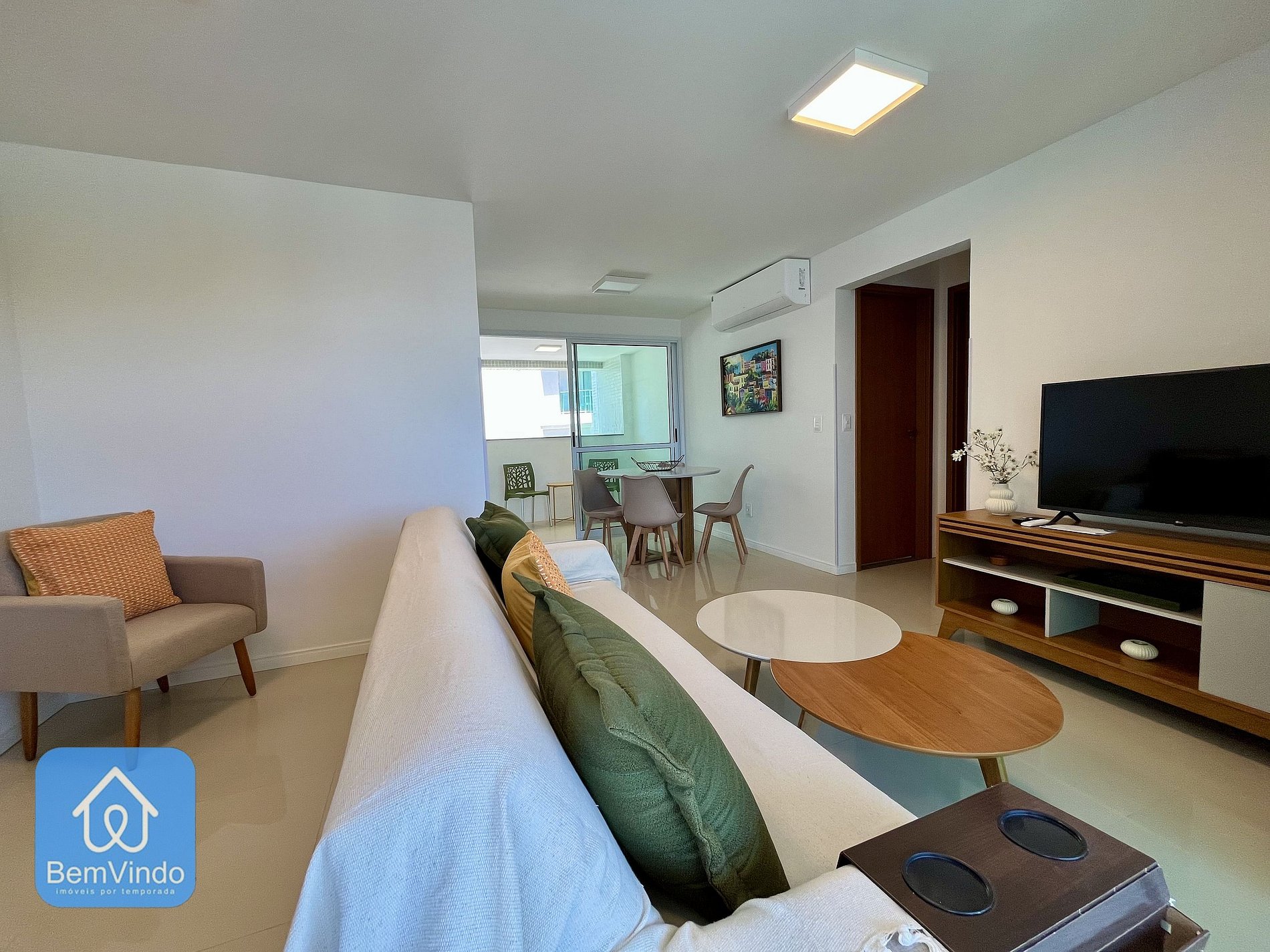 A sala de estar é espaçosa e aconchegante, com um sofá confortável e Smart TV, criando um ambiente acolhedor para relaxar.