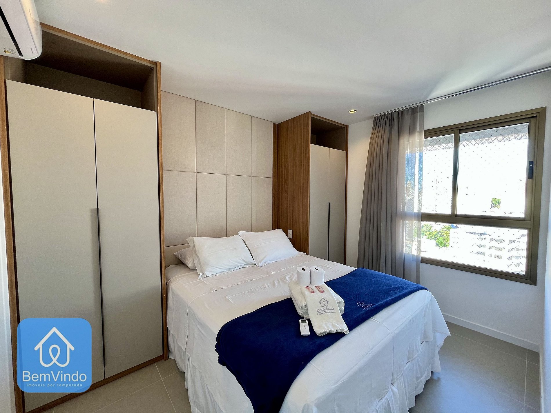 Nosso apartamento no Barra Conceito, com uma deslumbrante vista para o mar, foi cuidadosamente decorado e totalmente equipado para oferecer um ambiente acolhedor e funcional. A suíte climatizada, com ar-condicionado, dispõe de uma cama de casal nova e extremamente confortável, garantindo uma excelente noite de descanso após um dia explorando a cidade. O banheiro da suíte é outro destaque, com chuveiro e espelho amplo, unindo praticidade e sofisticação.