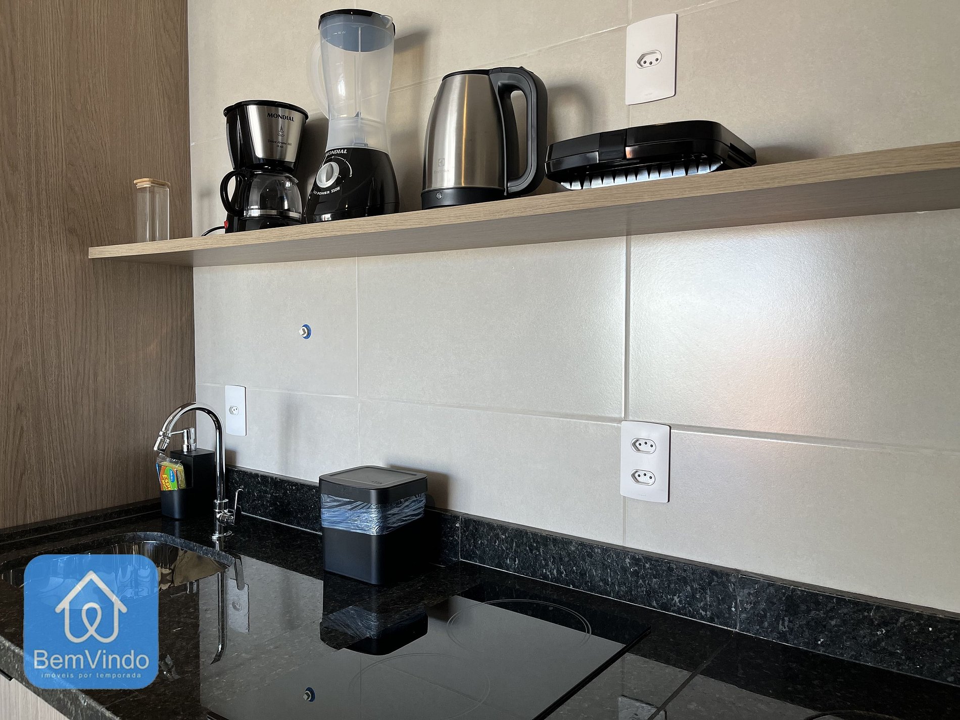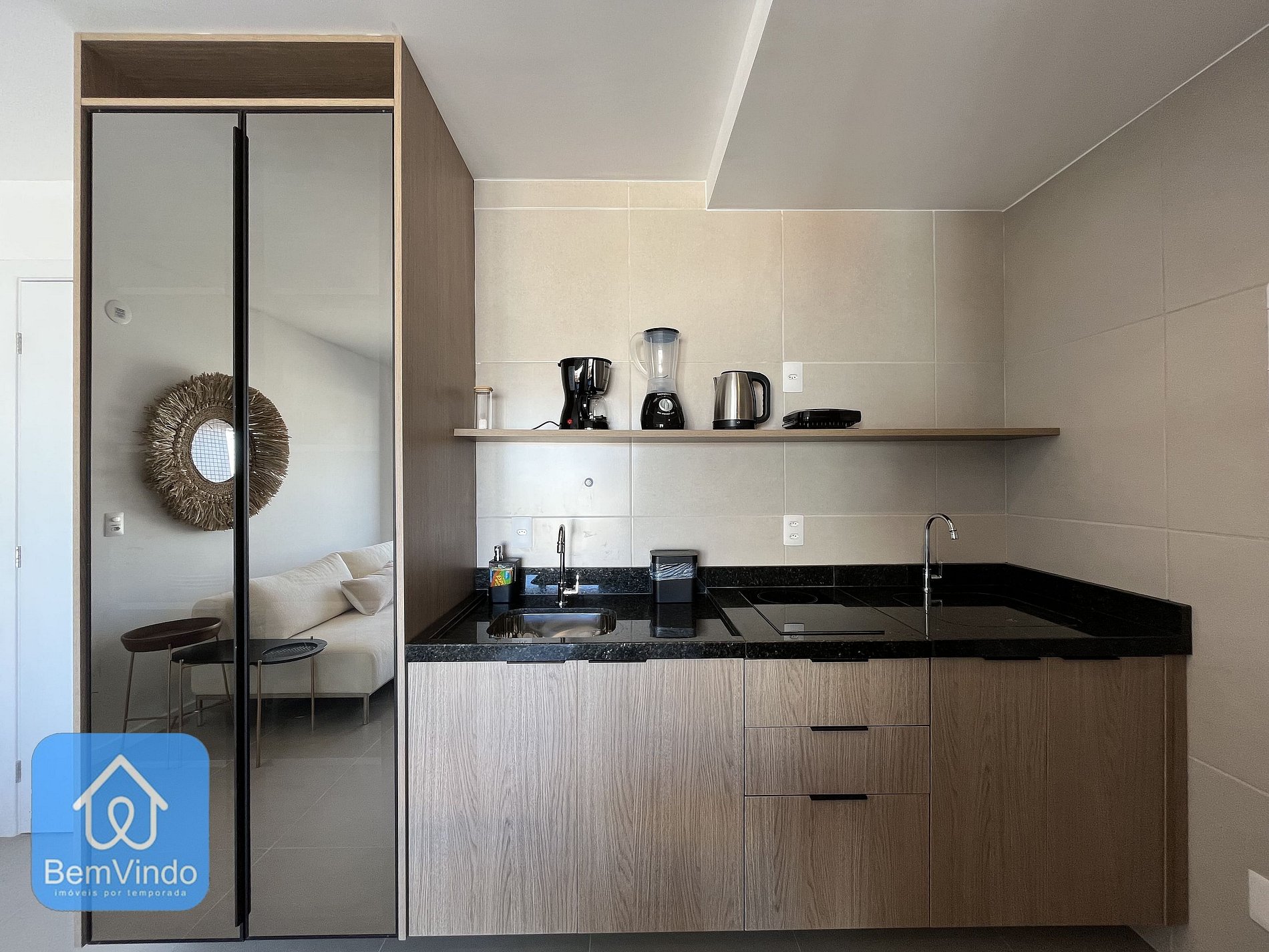 A cozinha, prática e completa, está equipada com cooktop elétrico, micro-ondas, geladeira e todos os utensílios necessários para preparar suas refeições com conforto e praticidade.