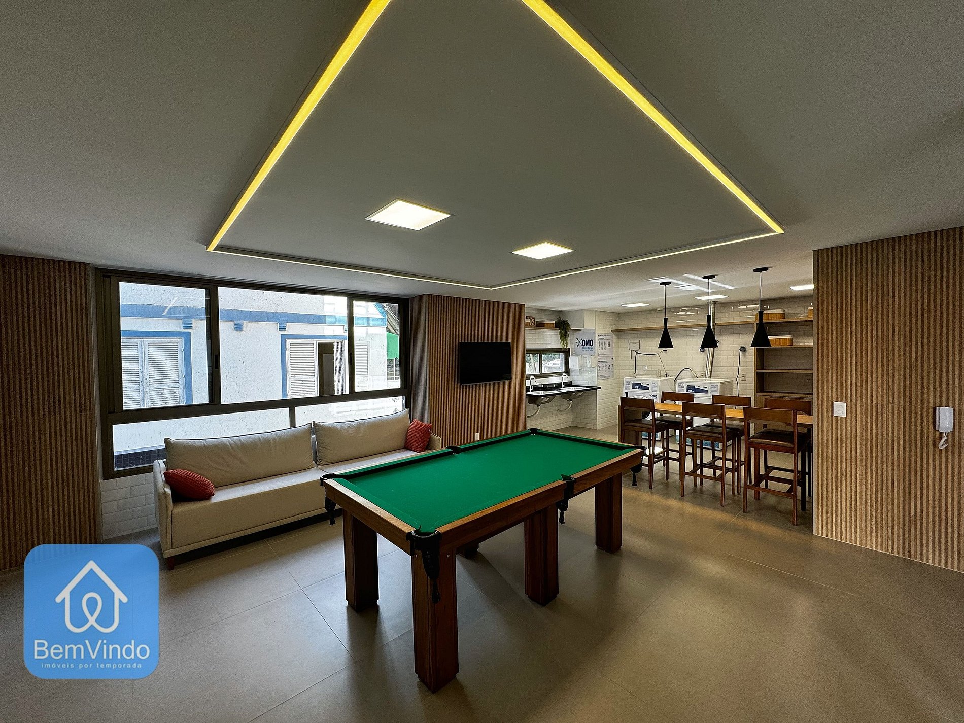 O Barra Conceito oferece uma experiência que vai muito além de uma simples hospedagem. O prédio dispõe de diversas comodidades para tornar sua estadia ainda mais confortável. Há uma vaga de garagem disponível para quem chega de carro, e a lavanderia compartilhada oferece um espaço acolhedor com sofá, cadeiras e uma mesa de sinuca, criando um ambiente descontraído e ideal para socialização.