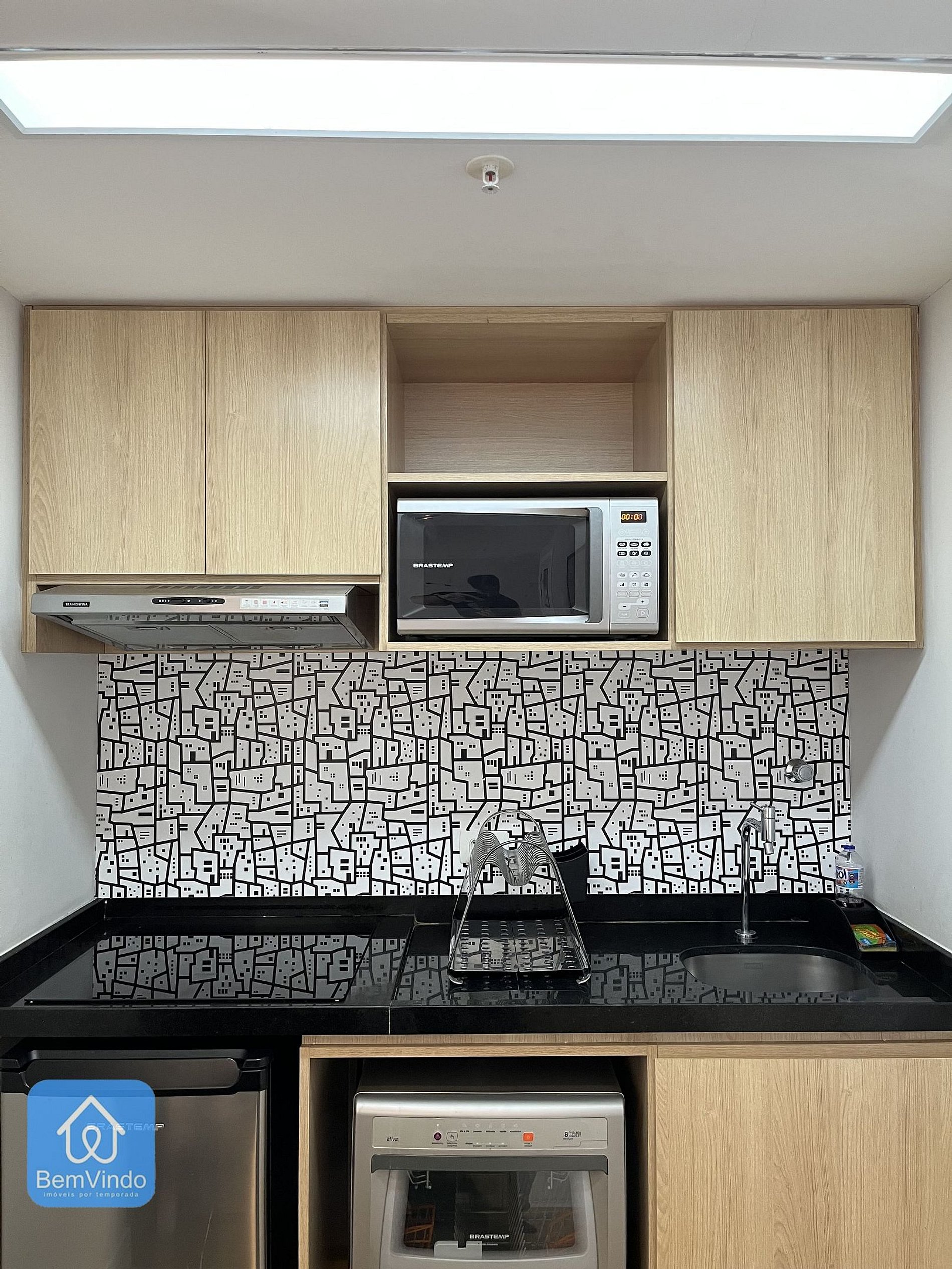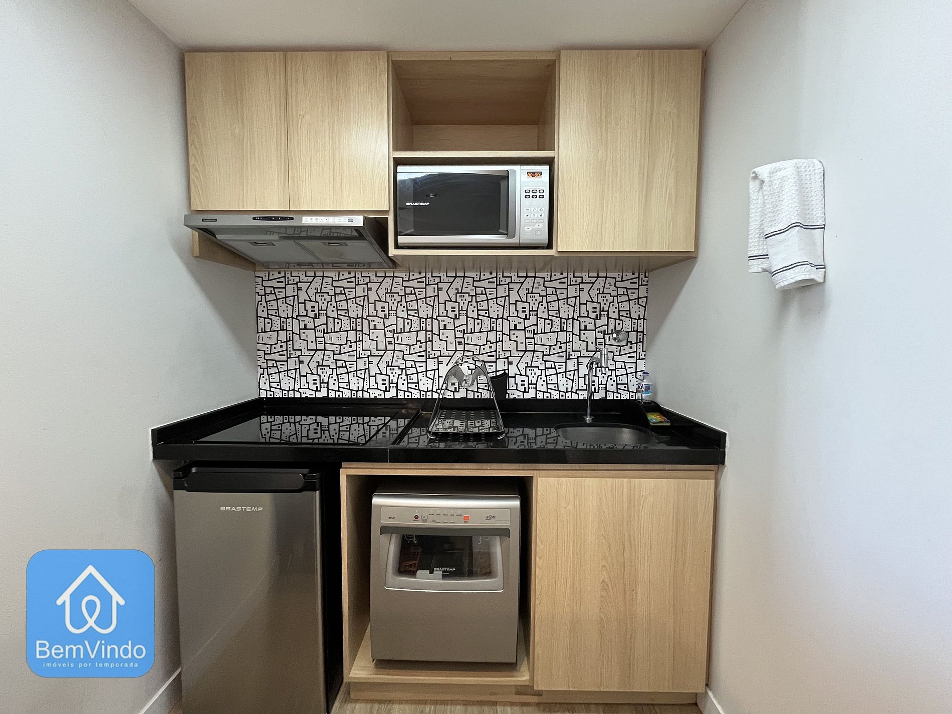A cozinha, prática e completa, está equipada com cooktop elétrico, forno, micro-ondas, figrobar e todos os utensílios necessários para preparar suas refeições com conforto e praticidade.