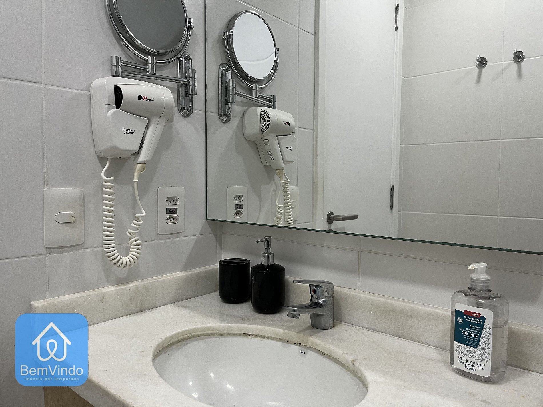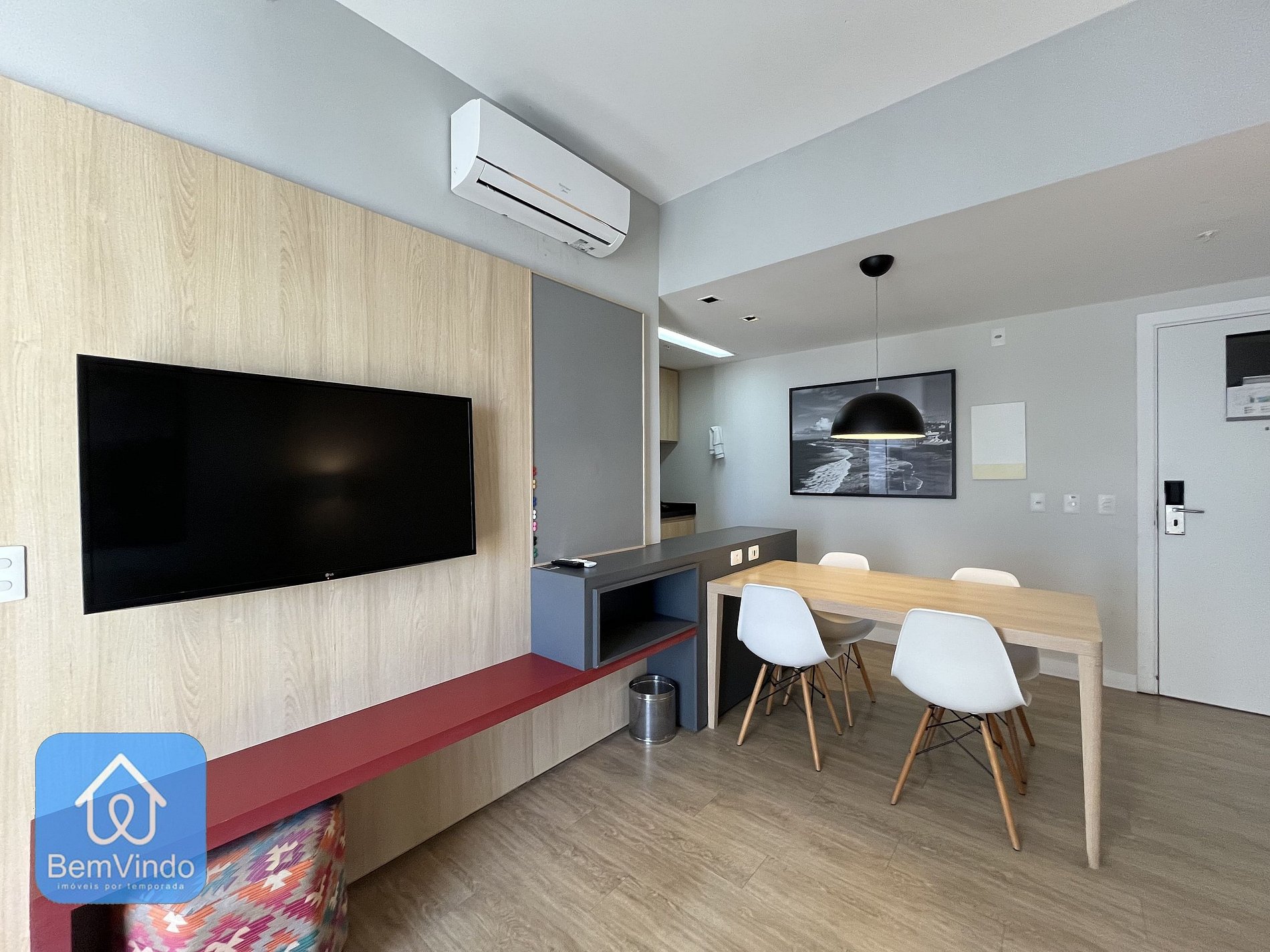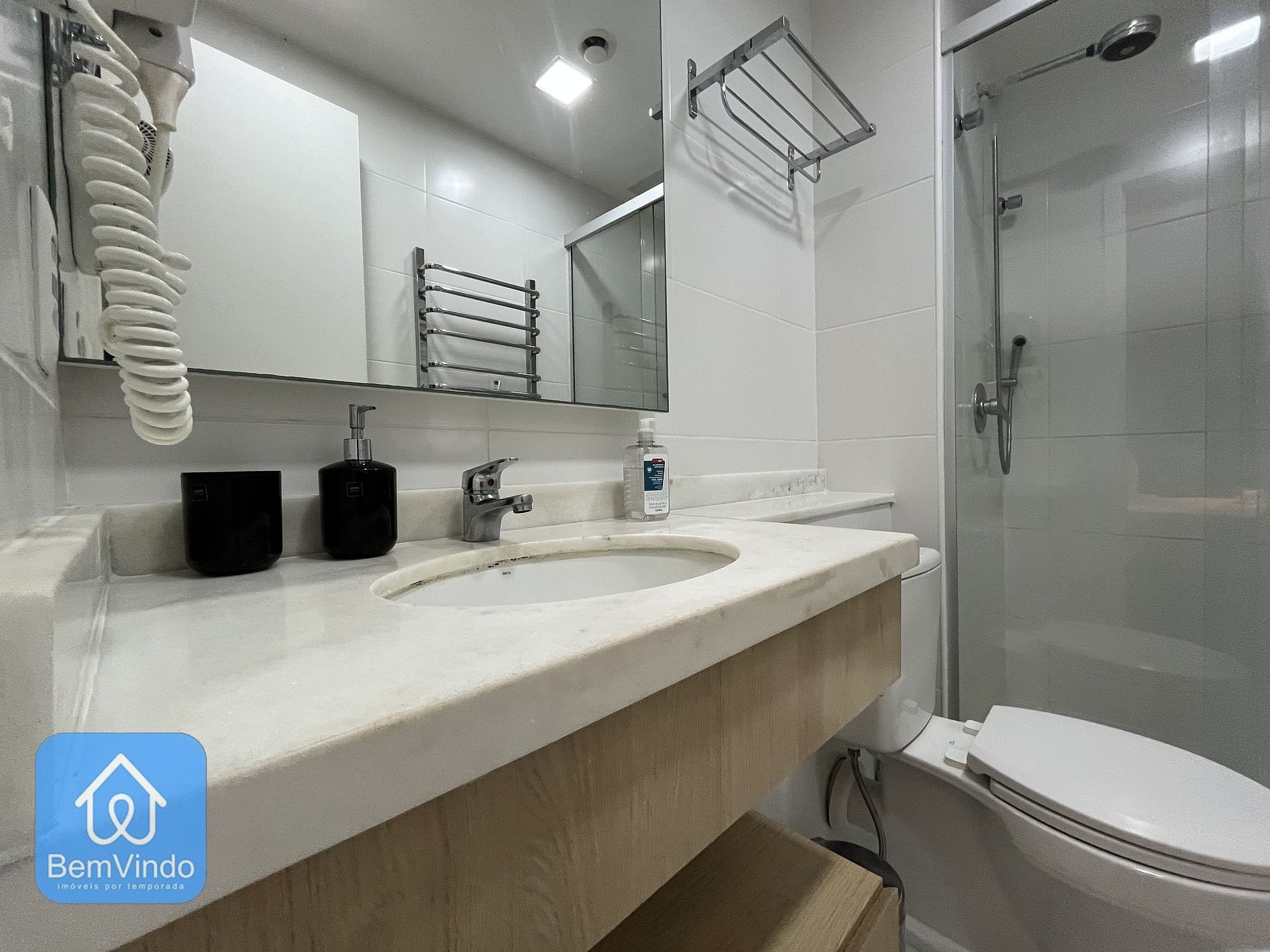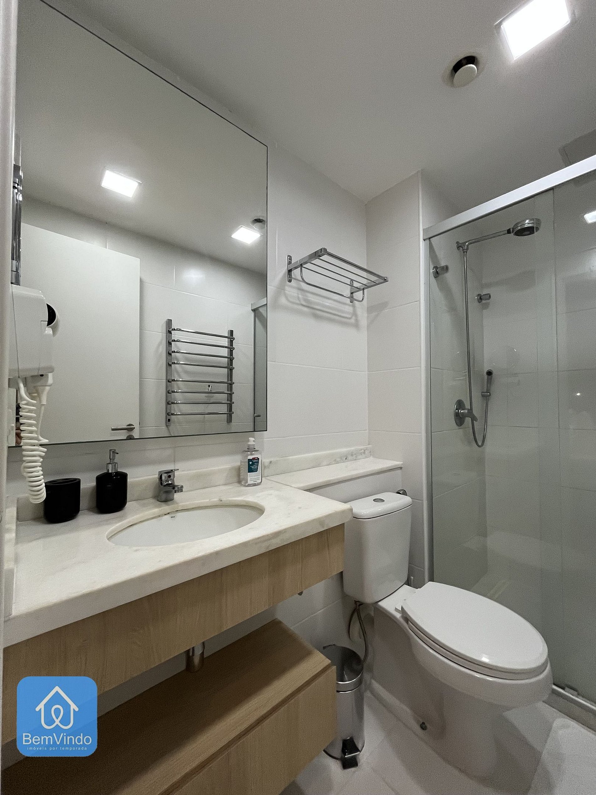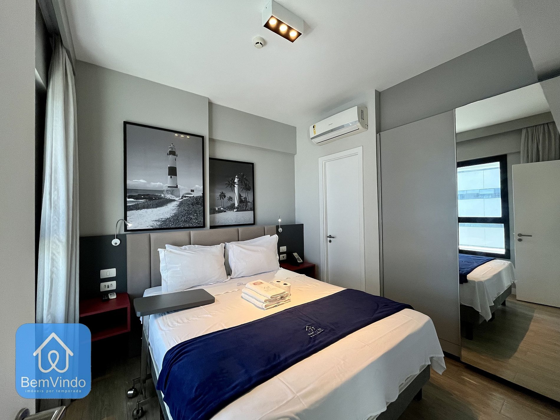 Nosso apartamento no Mondial, foi cuidadosamente decorado e totalmente equipado para oferecer um ambiente acolhedor e funcional. A suíte climatizada, com ar-condicionado, dispõe de uma cama de casal nova e extremamente confortável, garantindo uma excelente noite de descanso após um dia explorando a cidade. O banheiro da suíte é outro destaque, com secador e espelho amplo, unindo praticidade e sofisticação.