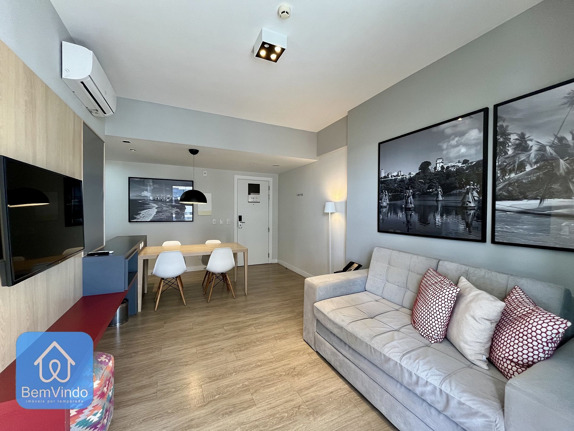 A sala de estar é espaçosa e aconchegante, com um sofá-cama confortável e Smart TV, criando um ambiente acolhedor para relaxar.