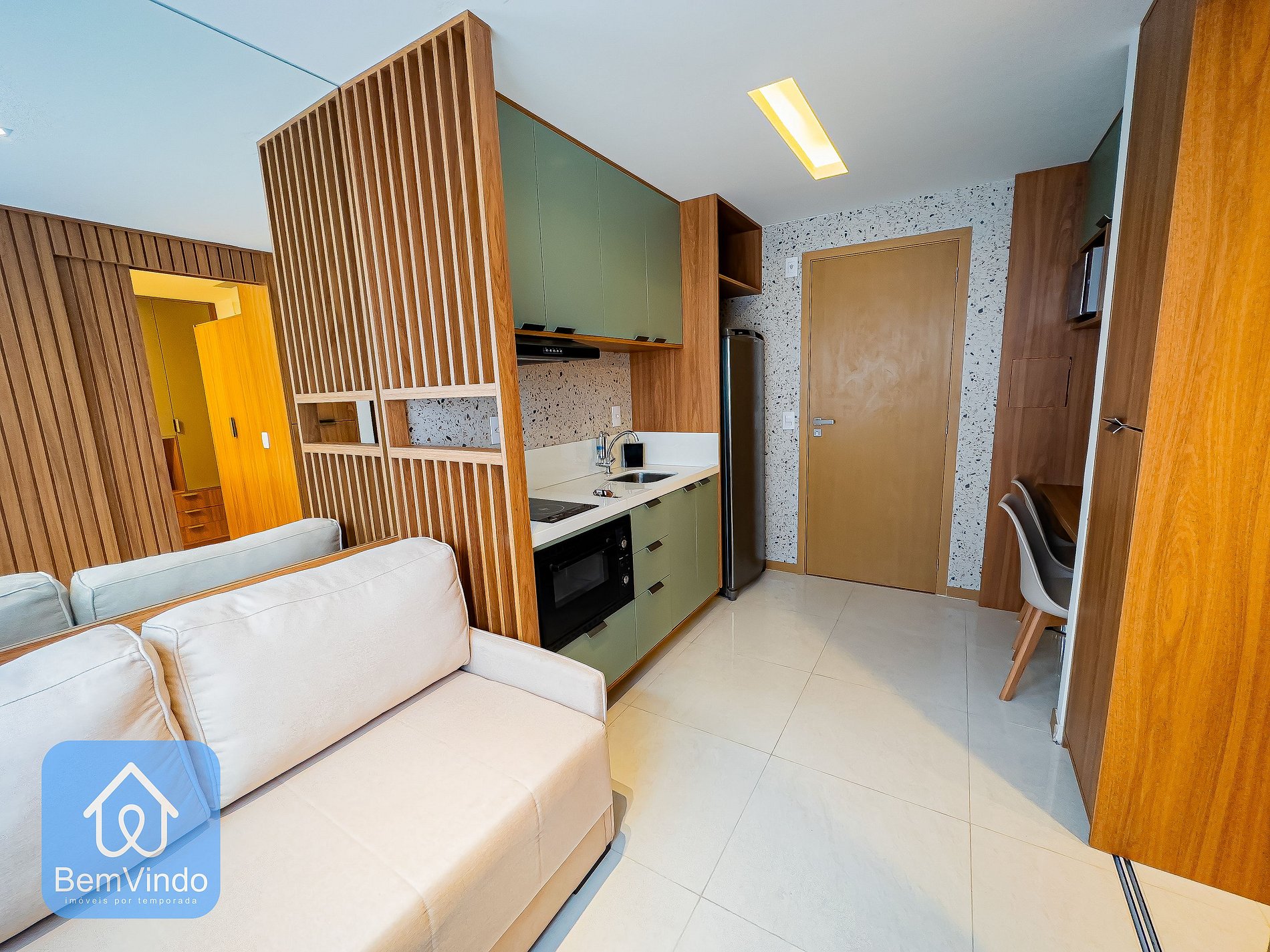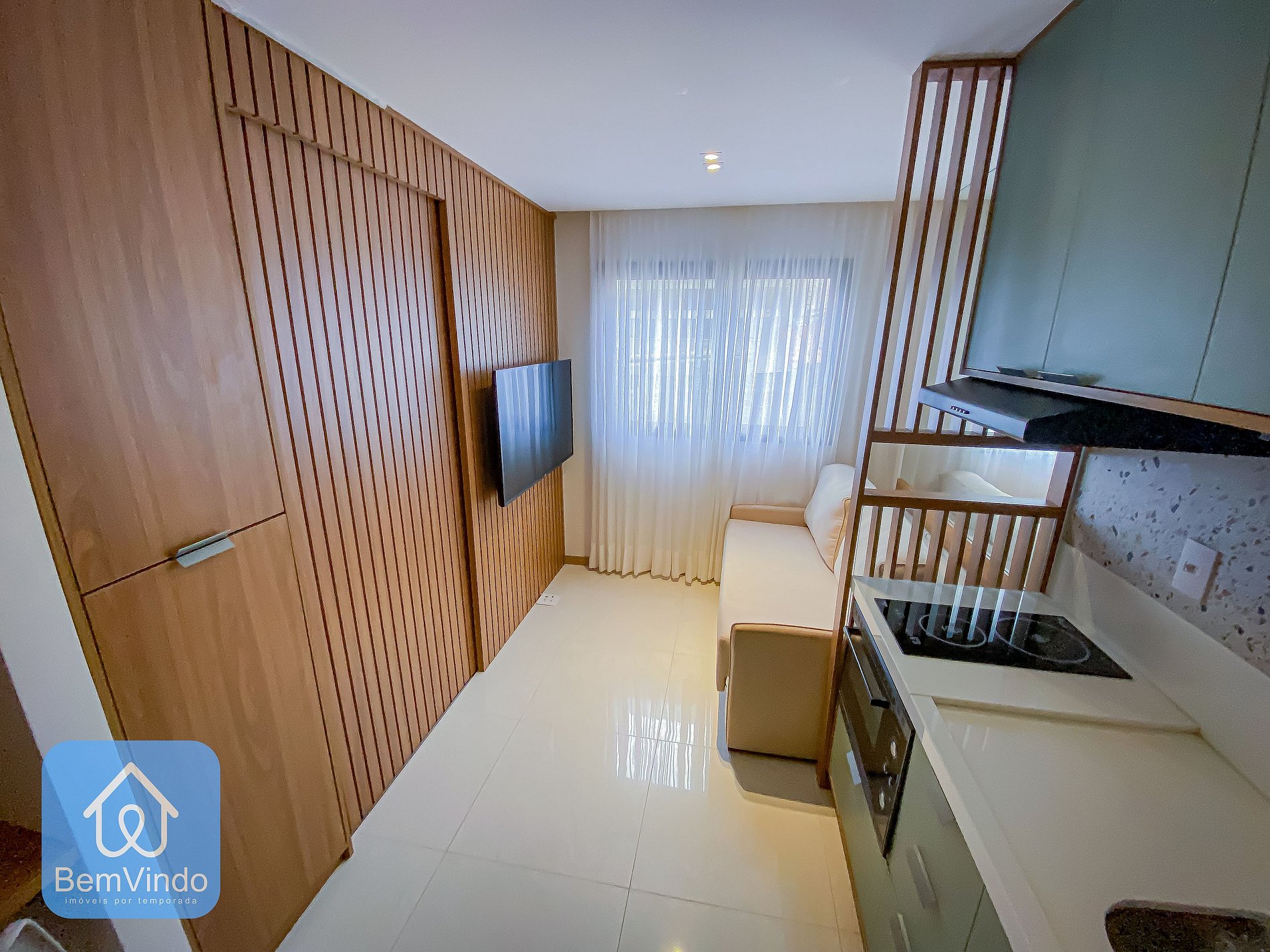 A sala é decorada com móveis planejados para oferecer o maior conforto possível, além de um sofá para relaxar o apartamento conta com uma cama nova e confortável e um ar condicionado para resfriar o calor Baiano;