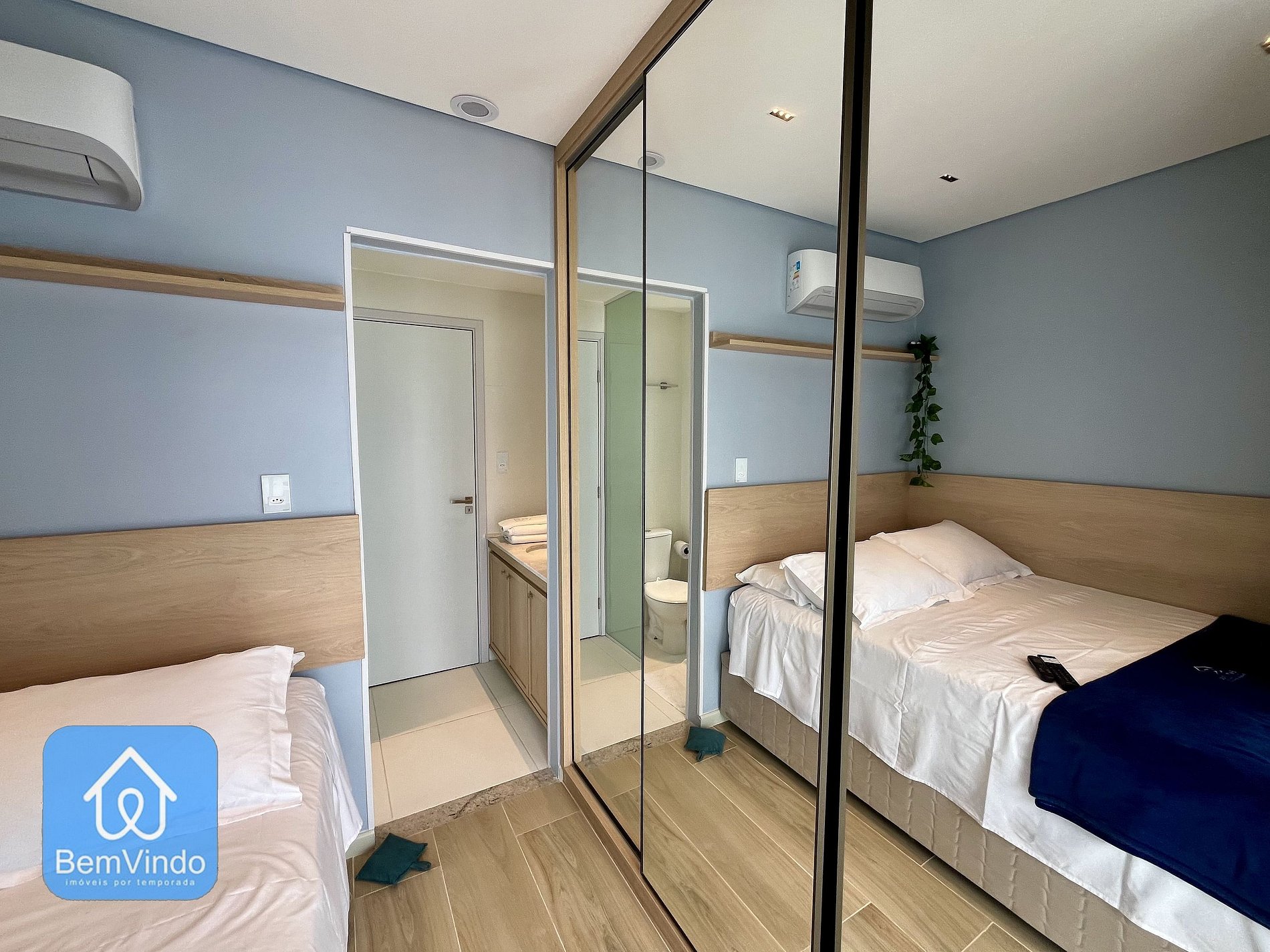 Quarto: Conforto e privacidade em um ambiente climatizado com cama de casal nova, guarda-roupas espaçosos e espelhados, Smart Tv e cortina blackout para garantir noites tranquilas de sono.