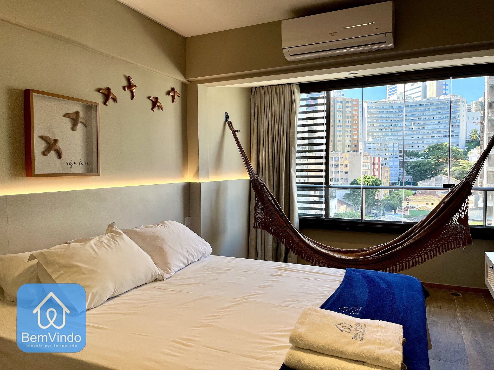 O apartamento possui: Cama de casal nova e superconfortável, para garantir noites de descanso agradáveis. Ar-condicionado para manter a temperatura sempre agradável durante o calor da cidade. Smart TV para aproveitar seus filmes e séries favoritos com total comodidade. Guarda-roupas espaçoso para organizar suas roupas e pertences. A cozinha é completa, oferecendo: Fogão, micro-ondas e geladeira. Todos os utensílios necessários para preparar suas refeições com praticidade (panelas, pratos, talheres, etc.). O banheiro é amplo e confortável, com todos os itens essenciais para uma estadia agradável. Varanda possui uma rede para descanso, criando um espaço aconchegante para para relaxar. Lazer e infraestrutura: O prédio oferece uma área de lazer incrível, com diversas opções para relaxar e se divertir: Piscina com vista mar – um ótimo local para relaxar enquanto aprecia a vista deslumbrante. Espreguiçadeiras para aproveitar o sol e o clima tropical de Salvador. Espaço gourmet com churrasqueira (consulte a disponibilidade na portaria). Academia bem equipada para quem gosta de manter a rotina de exercícios durante a viagem. Lavanderia para maior conveniência durante a sua estadia. Além disso, o apartamento oferece vaga de garagem no prédio, para maior comodidade