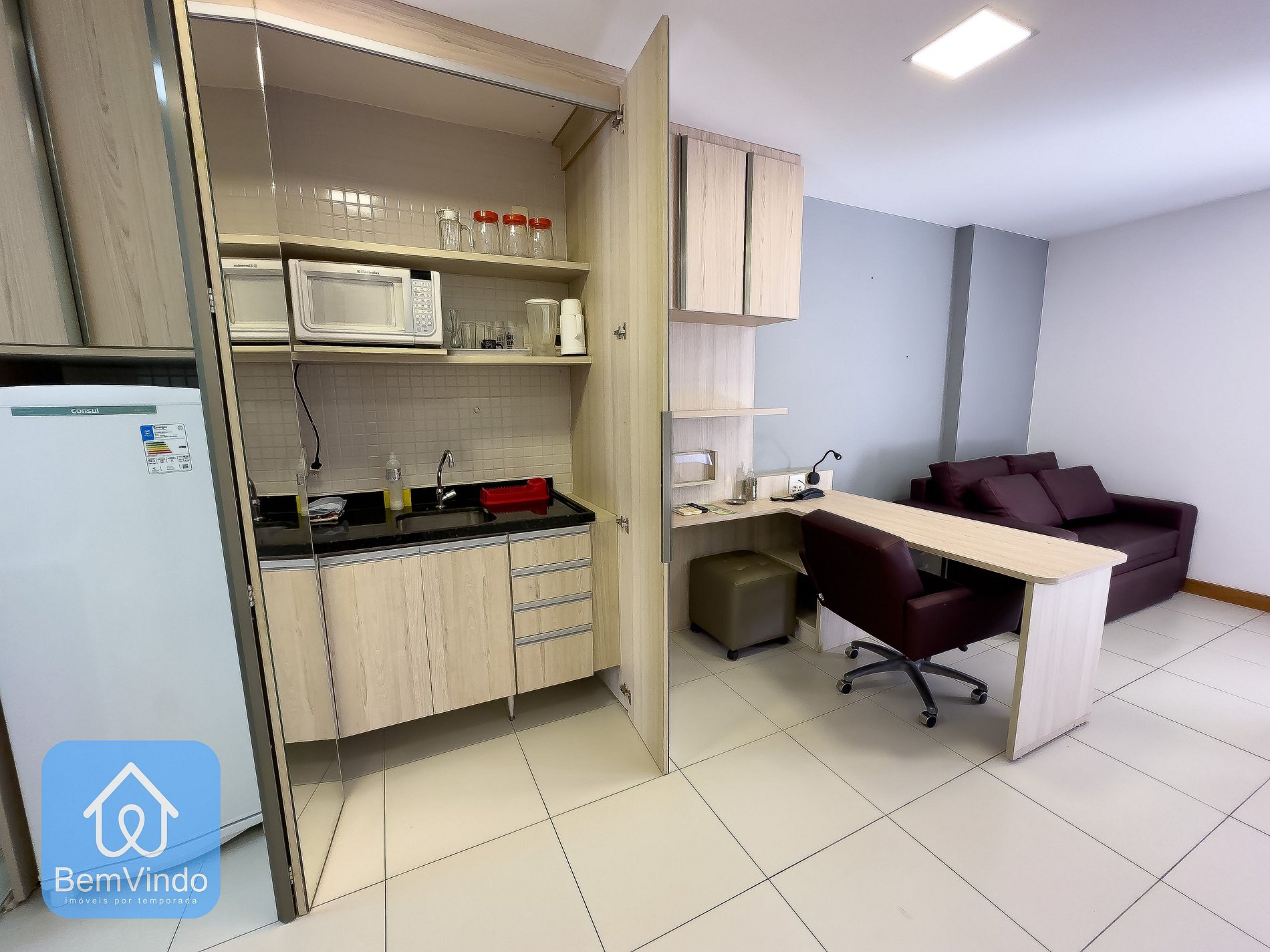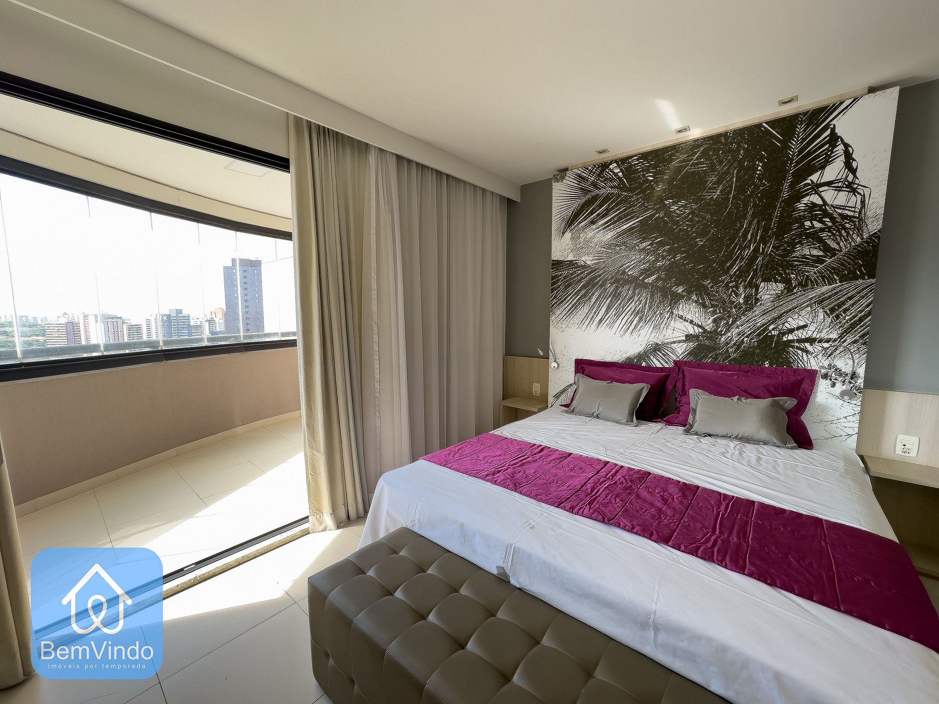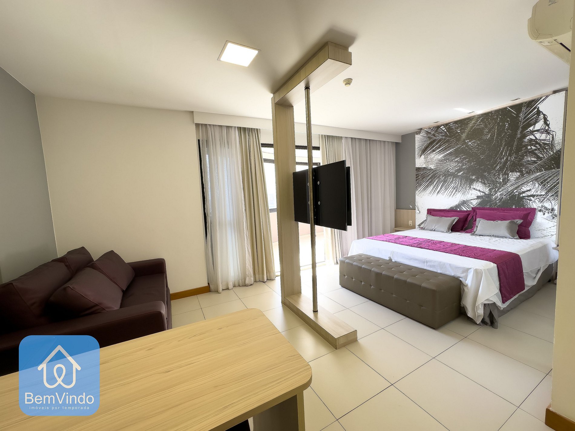 A sala é decorada com móveis planejados para oferecer o maior conforto possível, além de um sofá para relaxar o apartamento conta com uma cama queen nova e confortável e dois ar condicionados para resfriar o calor Baiano;