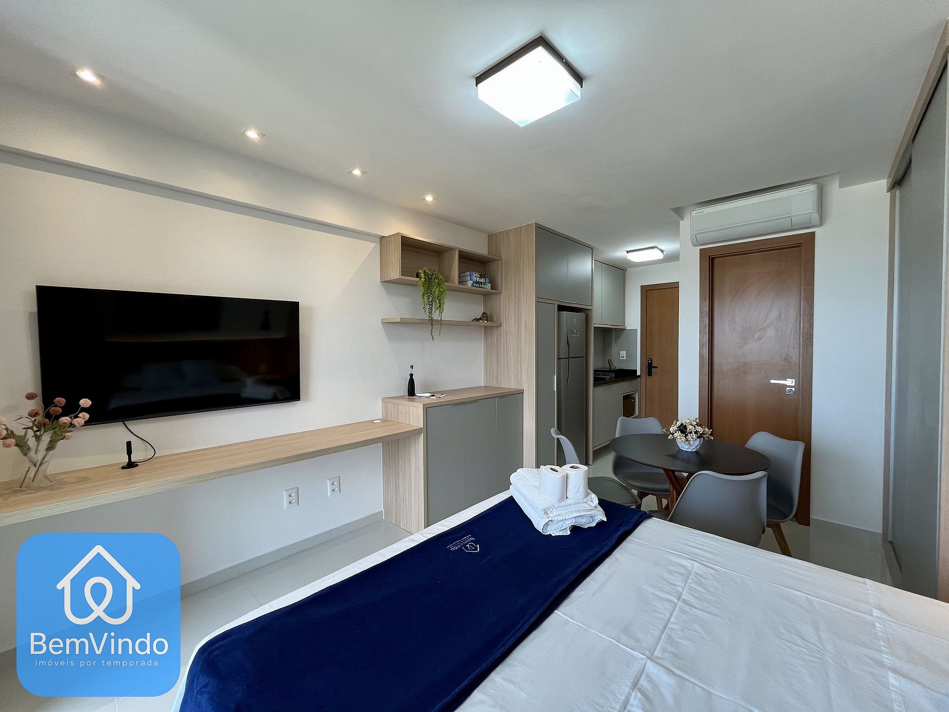 Ar-condicionado para manter a temperatura sempre agradável durante o calor da cidade. Smart TV para aproveitar seus filmes e séries favoritos com total comodidade. Guarda-roupa espaçoso para organizar suas roupas e pertences.