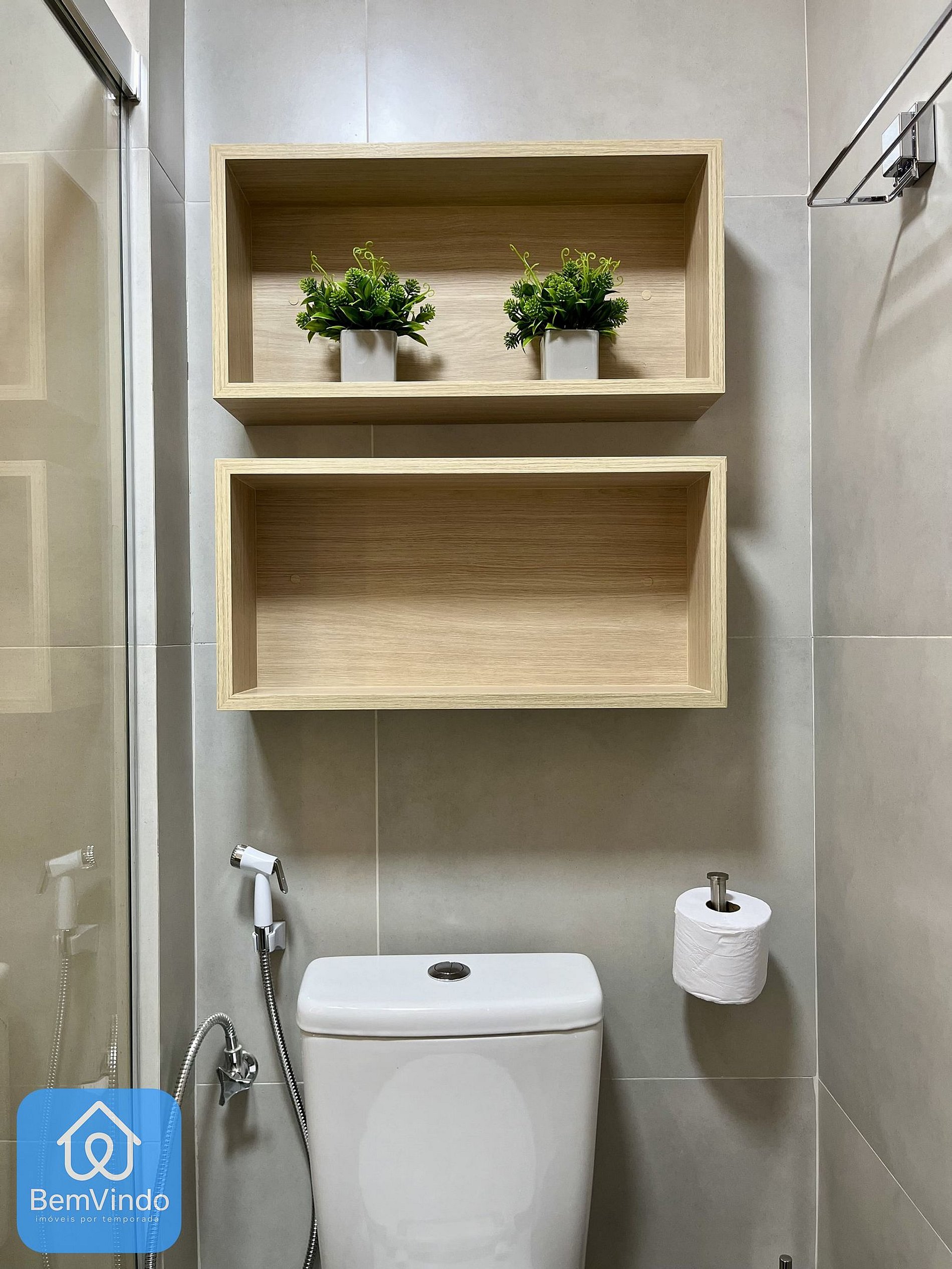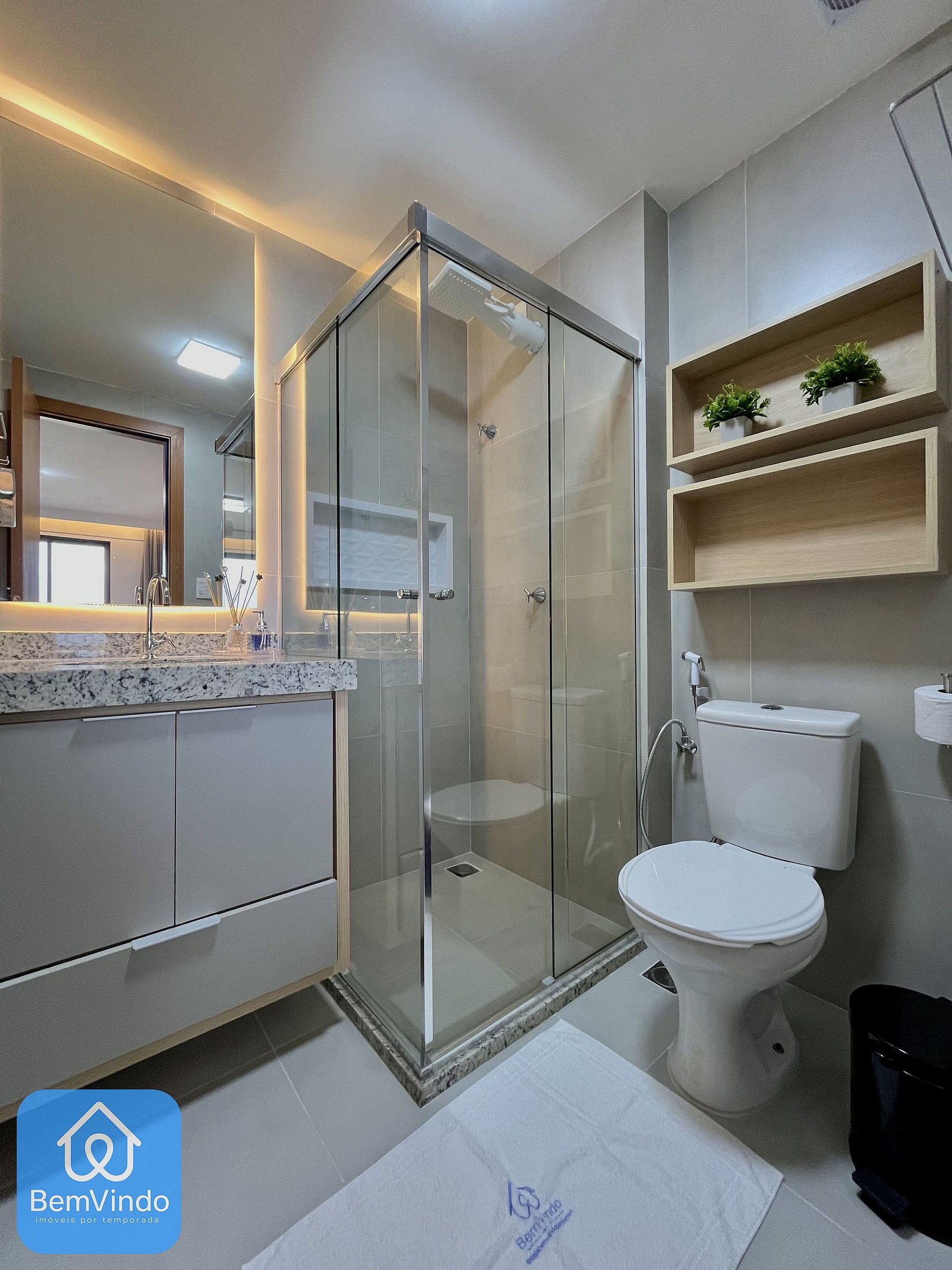 O banheiro é amplo e confortável, com todos os itens essenciais para uma estadia agradável.
