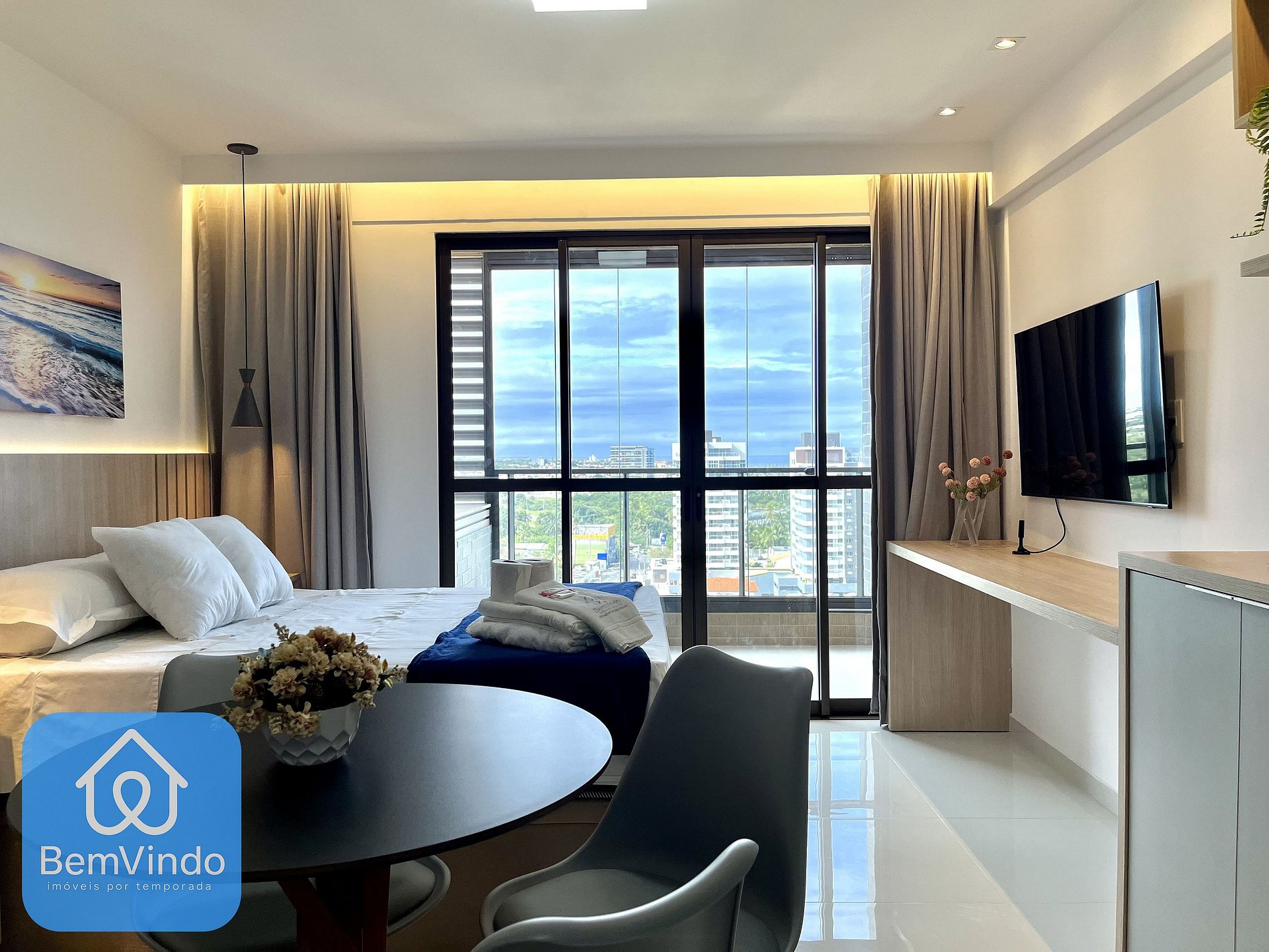Ar-condicionado para manter a temperatura sempre agradável durante o calor da cidade. Smart TV para aproveitar seus filmes e séries favoritos com total comodidade. Guarda-roupa espaçoso para organizar suas roupas e pertences.