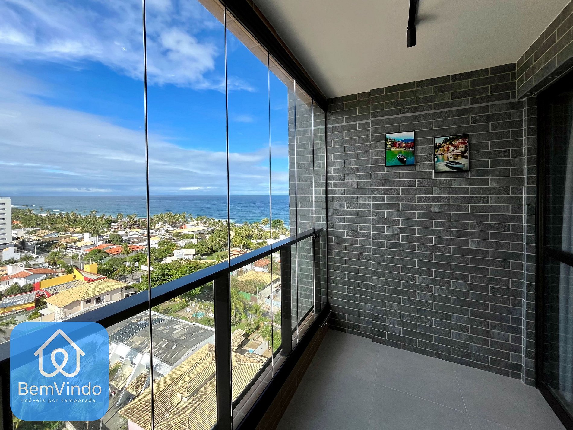 Varanda possui linda vista para o mar de Itapuã, criando um espaço aconchegante para refeições ou para relaxar.