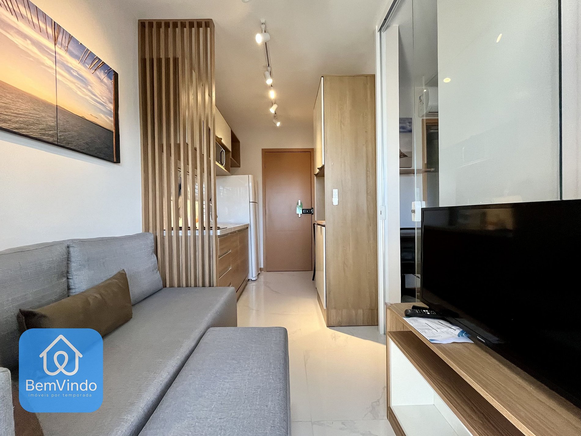 A sala de estar é espaçosa e aconchegante, com um sofá confortável e Smart TV, criando um ambiente acolhedor para relaxar. Possui também uma varanda equipada.