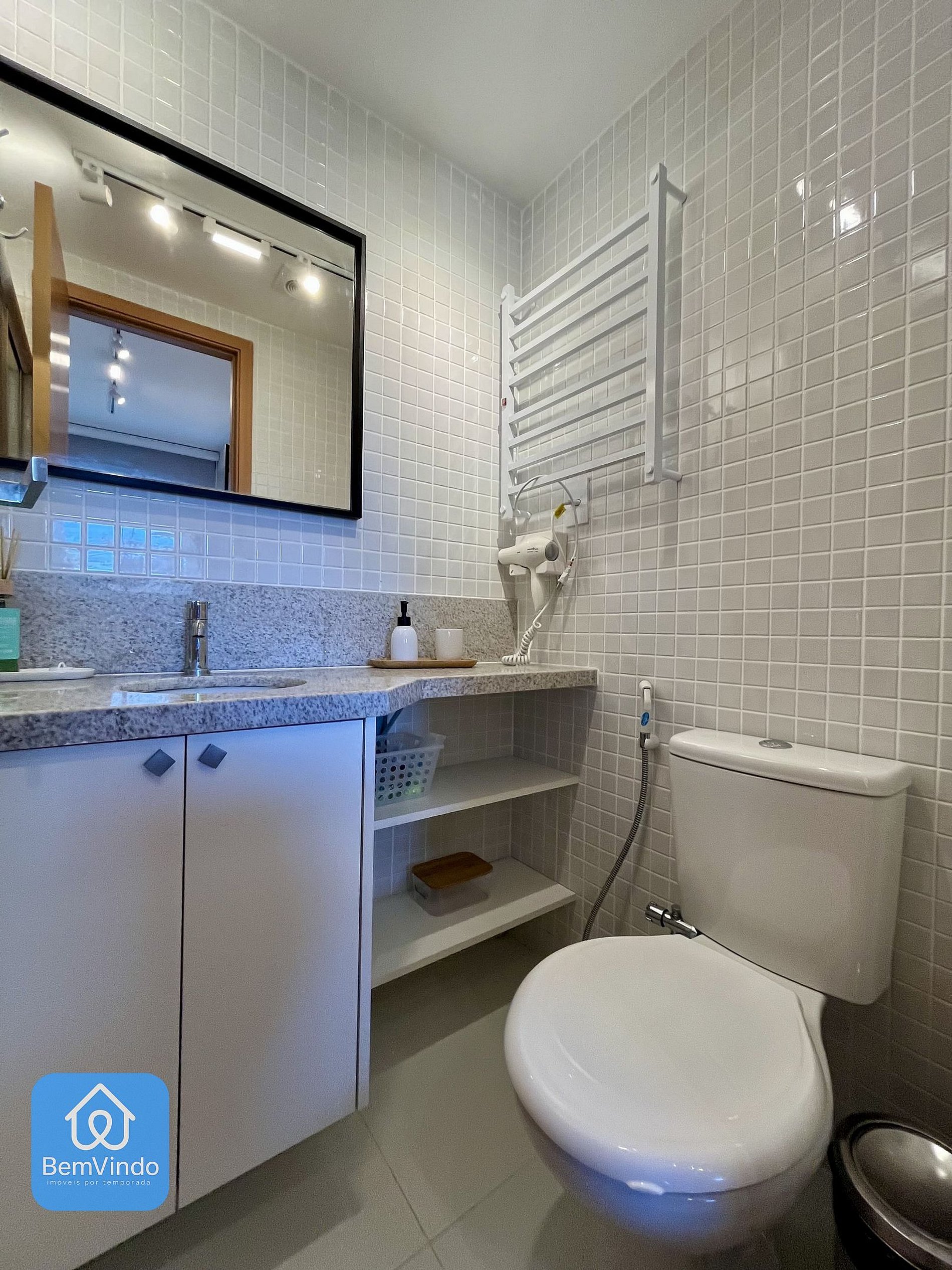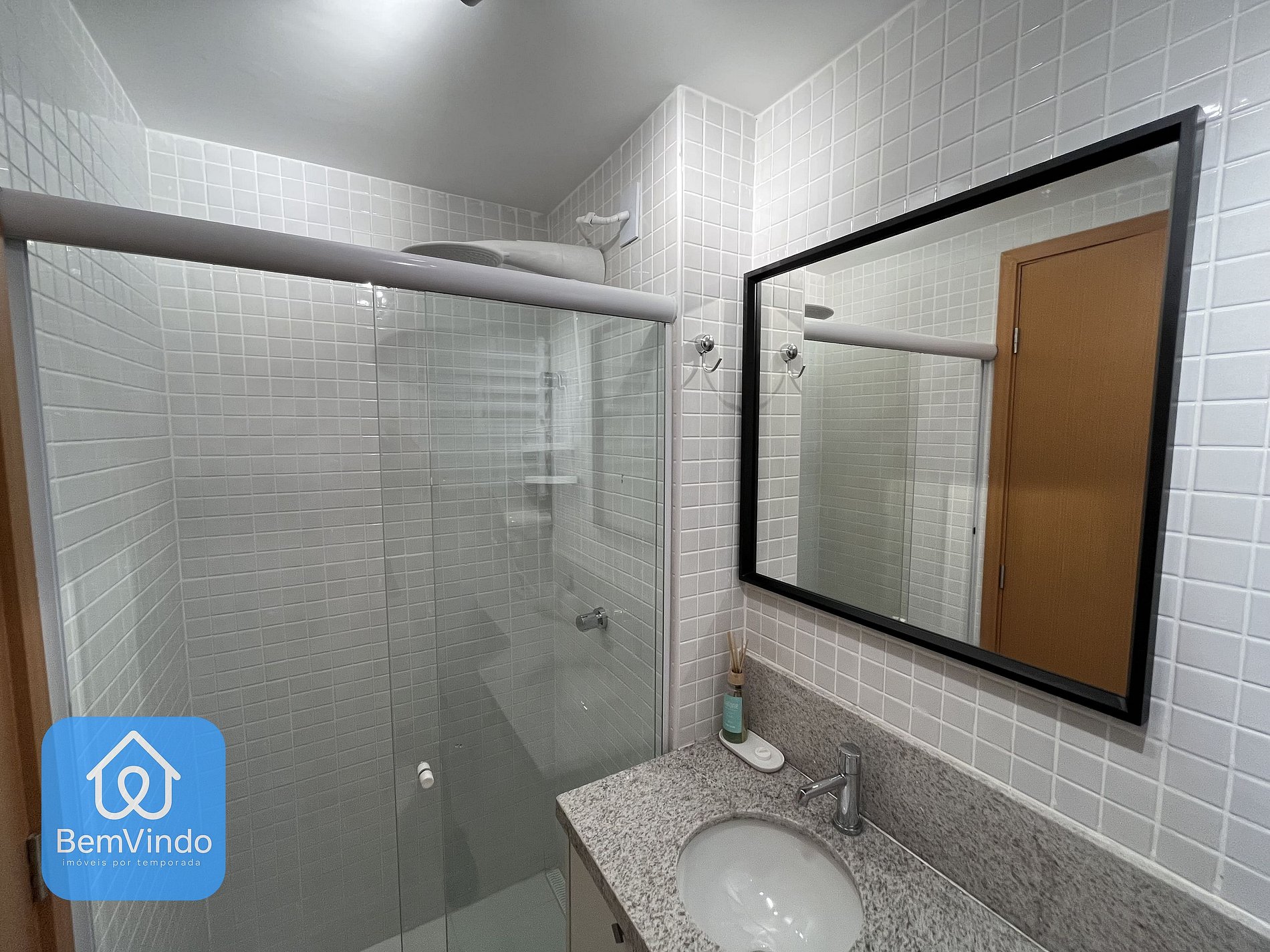O banheiro da suíte é outro destaque, com chuveiro e espelho amplo, unindo praticidade e sofisticação.