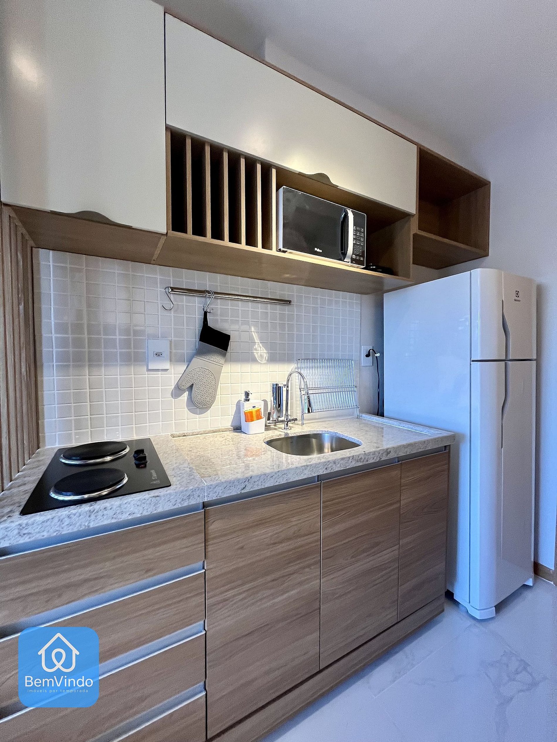 A cozinha, prática e completa, está equipada com cooktop elétrico, micro-ondas, geladeira e todos os utensílios necessários para preparar suas refeições com conforto e praticidade.