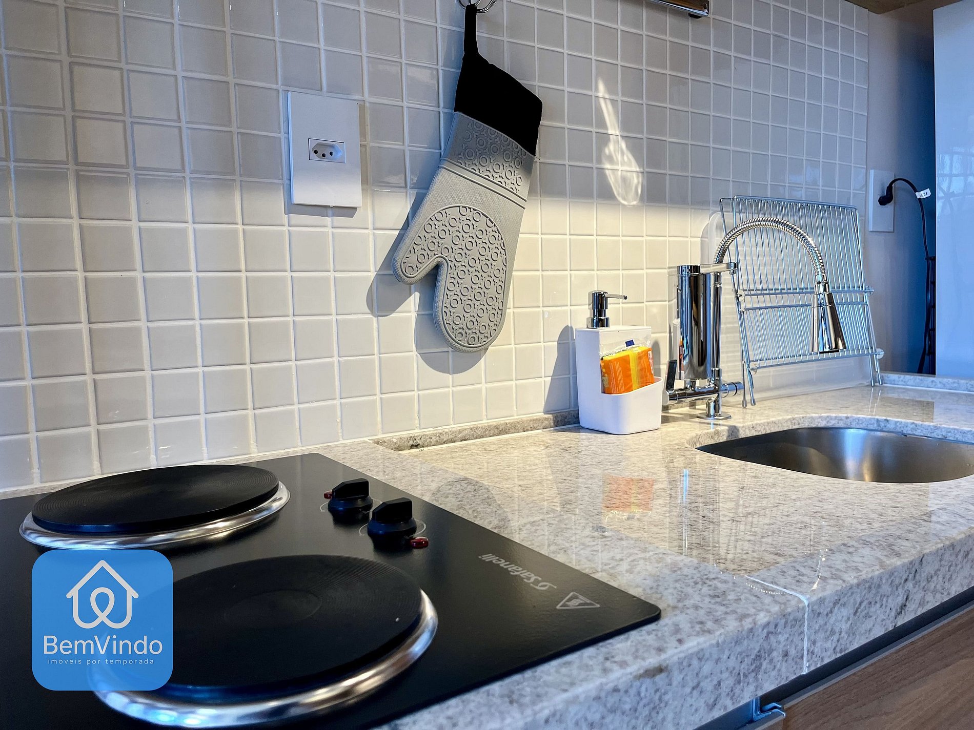 A cozinha, prática e completa, está equipada com cooktop elétrico, micro-ondas, geladeira e todos os utensílios necessários para preparar suas refeições com conforto e praticidade.