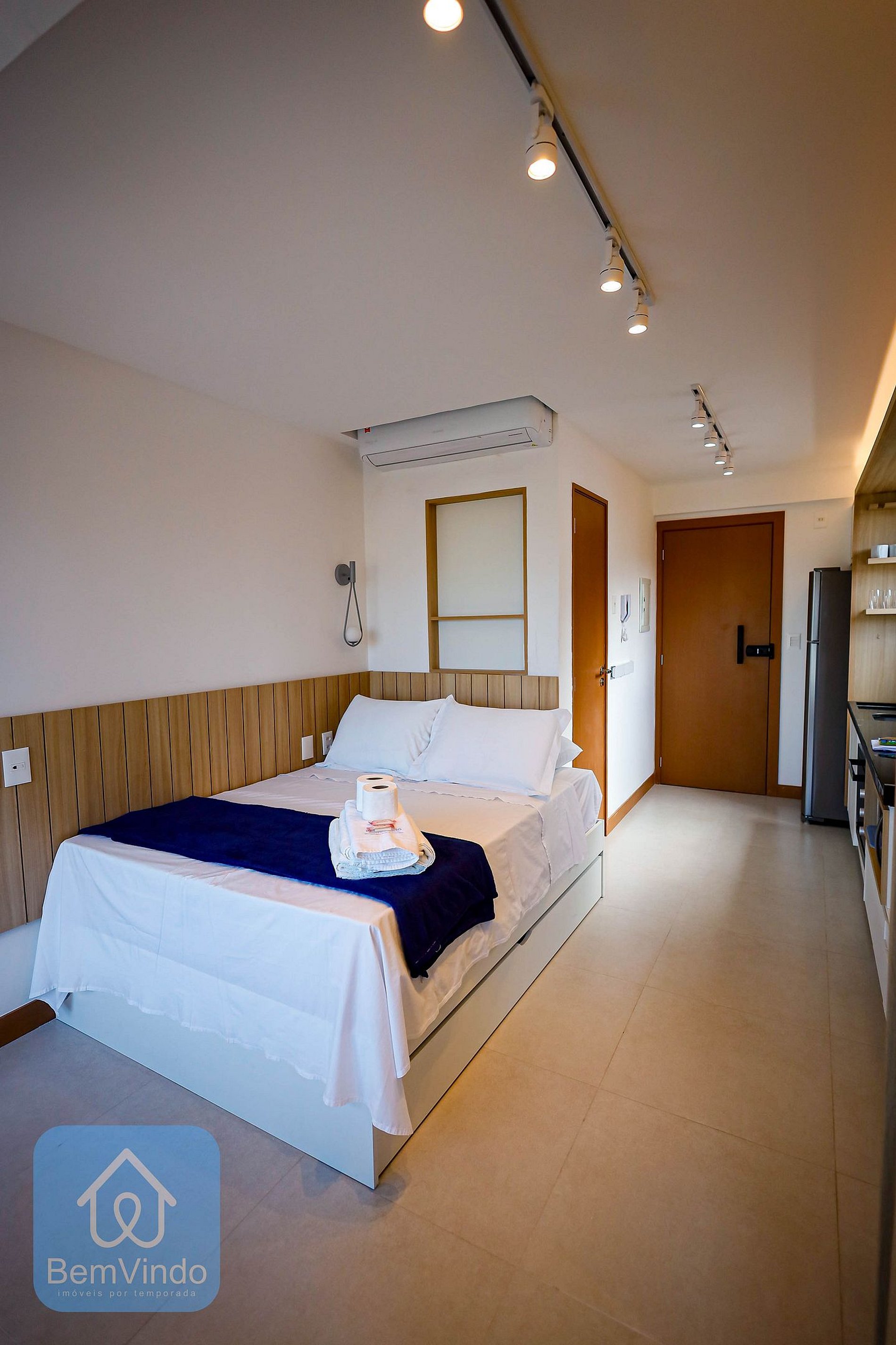Acomode-se em uma cama de casal confortável enquanto assiste à TV ou relaxa com o ar-condicionado. A janela panorâmica com cortina blackout garante noites tranquilas e um despertar com uma vista espetacular.